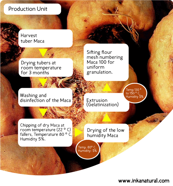 - Extrusion: is then carried to another machine - called EXTRUDER – this works under high pressure which produces a temperature that allows the starch granules of Maca can cook. When is the right temperature Maca becomes a kind of pasta, this process is called gelatinization.